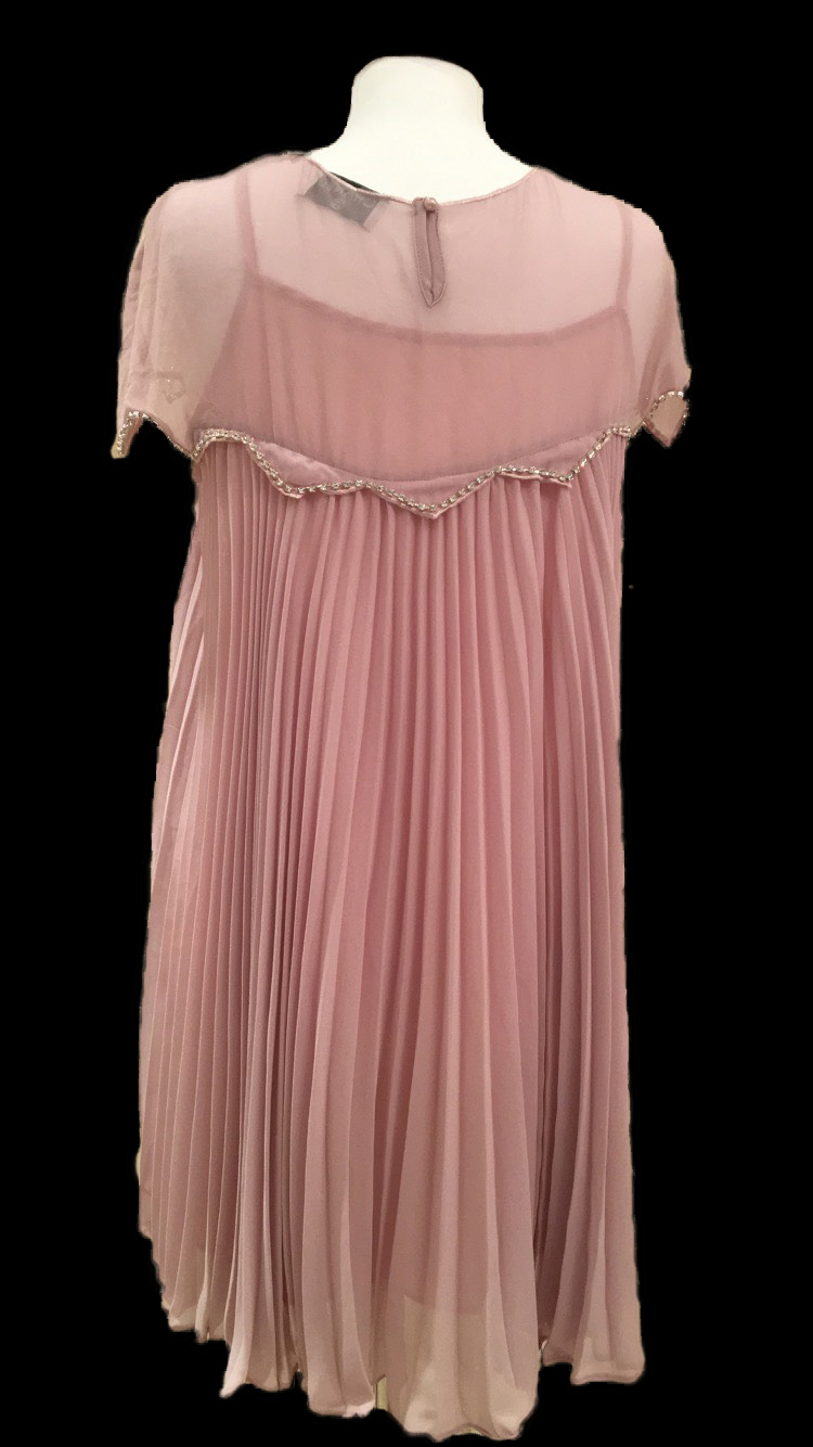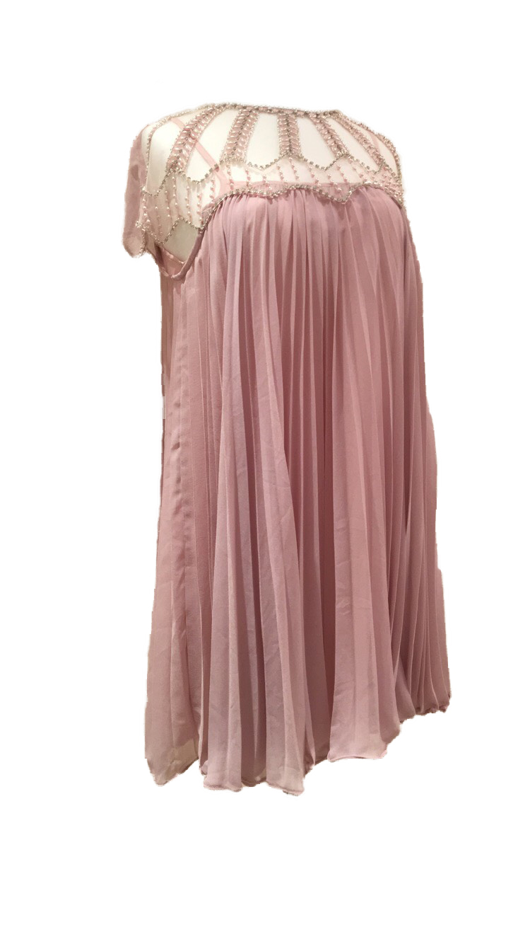 فستان للمناسبات والحفلات - فتحتة رقبة مستديرة - أكمام قصيرة - شيفون - كسرات - تل و شك ع الصدر - بطانه من نفس اللون - تصميم مميز وسهل الارتداء - تنظيف جاف - وردي
