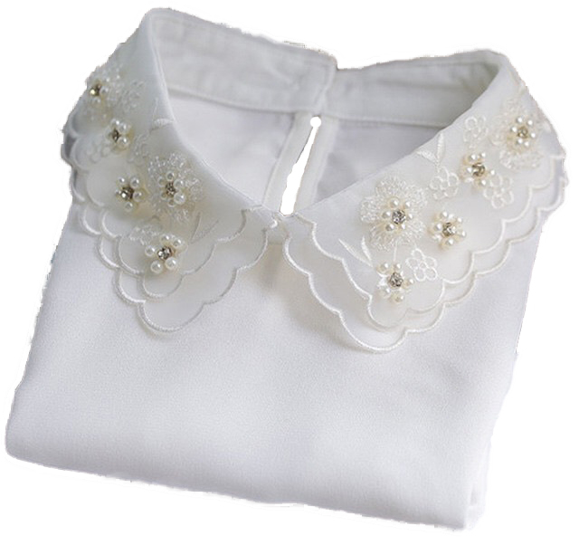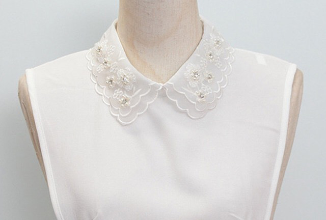 طوق قميص وهمي - اللون أبيض - قطن - دانتيل تطريز أبيض - مزين باللؤلؤ السكري - أغلاق بالازرار من الخلف