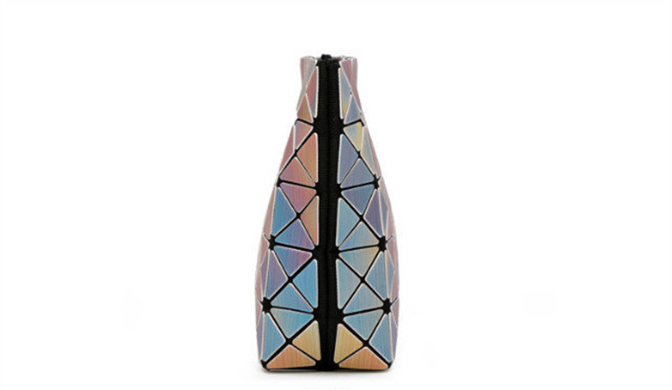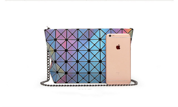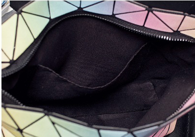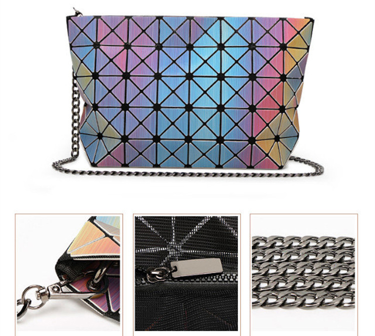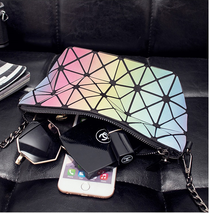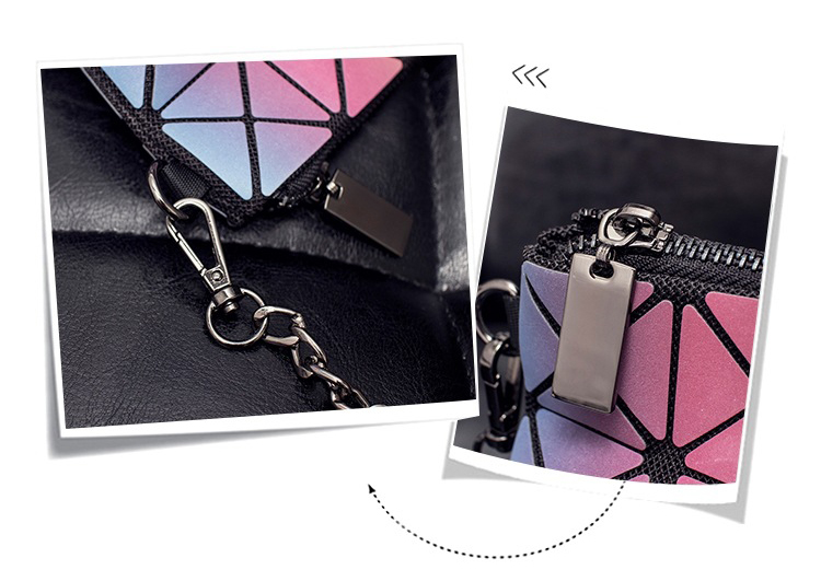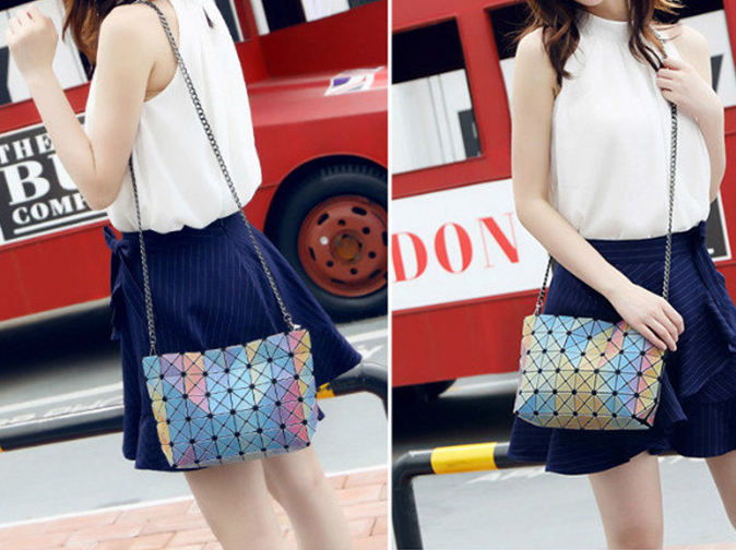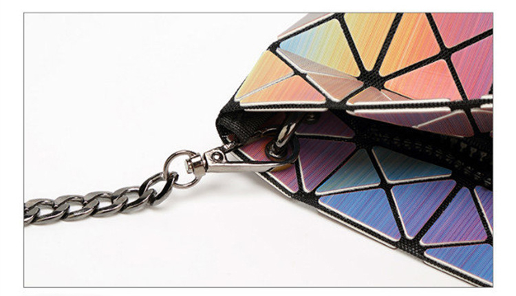 إليكِ حقيبة يد لامعة بألوان الحياة والسعادة بتصميم بنمط هندسي بشكل المثلثات وقاعدة من القماش الشبكي وحمّالة كتف ( سلسلة ) احمليها لإطلالة أنيقة لأوقاتك.