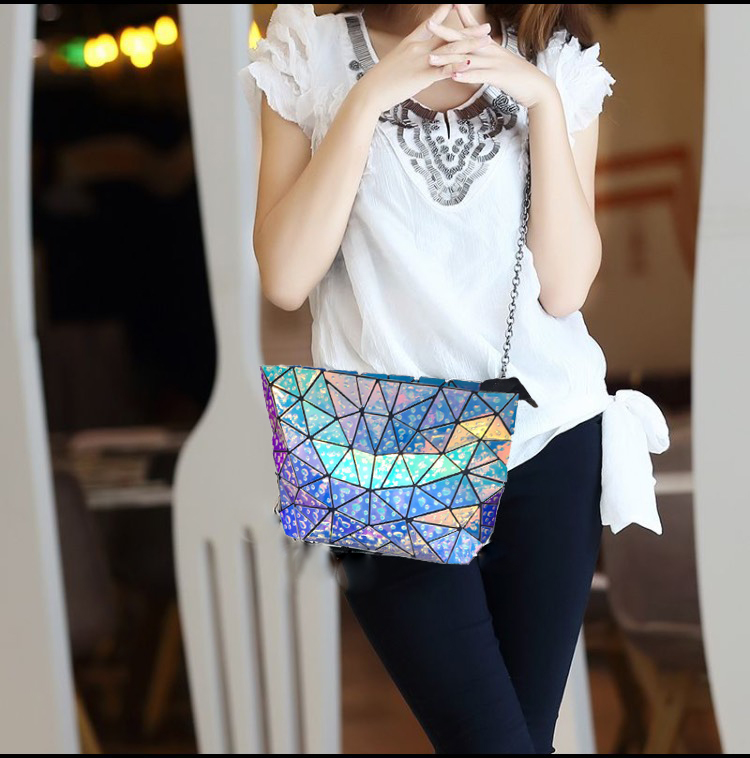 إليكِ حقيبة يد لامعة بتصميم بنمط هندسي بشكل المثلثات عليها قطرات الندى وقاعدة من القماش الشبكي .