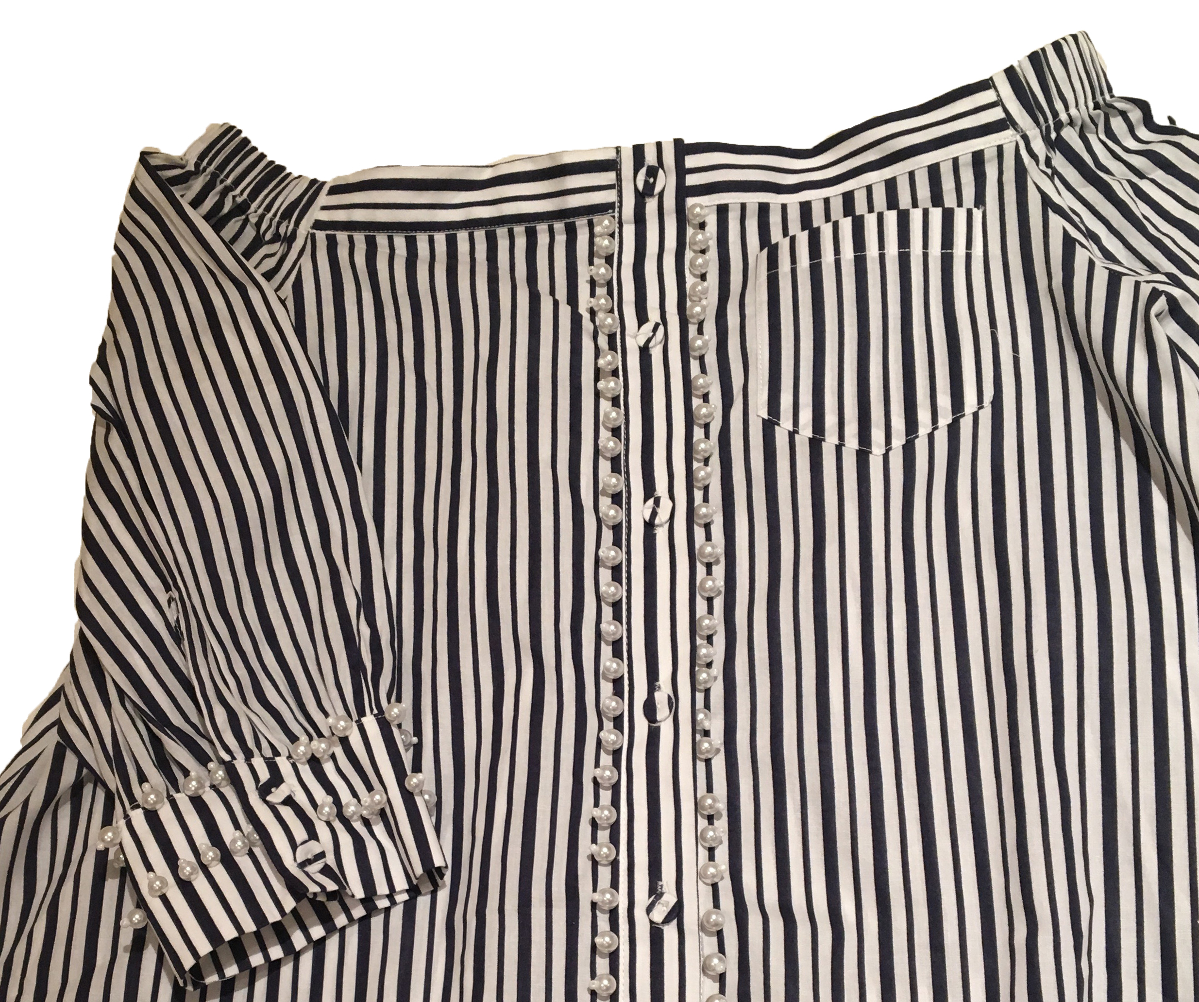 بلوزة مقلمة بالون الكحلي والأبيض عارية الاكتاف , واسعه تصميم أنيق وجذاب . مغاط على الاكتاف اكمام متوسطة الطول و واسعة مزينة باللؤلؤ على الأطراف وحول الازارير الاغلاق : ازرار أمامية